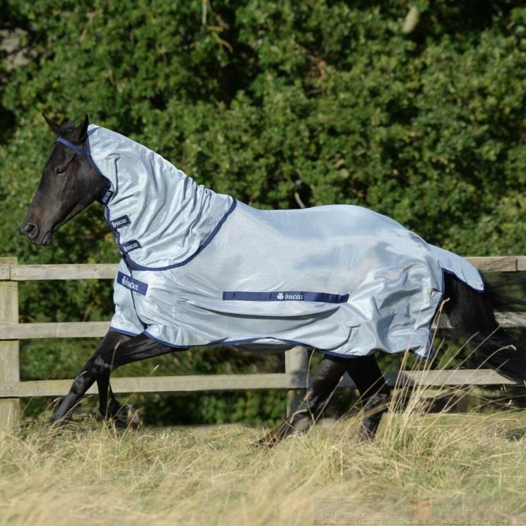 BucasIt gives the choice to protect only the body of the horse, or both the body and the neck of the horse by attaching the neck part. The neck has a loop over the ears so that it stays in place.
