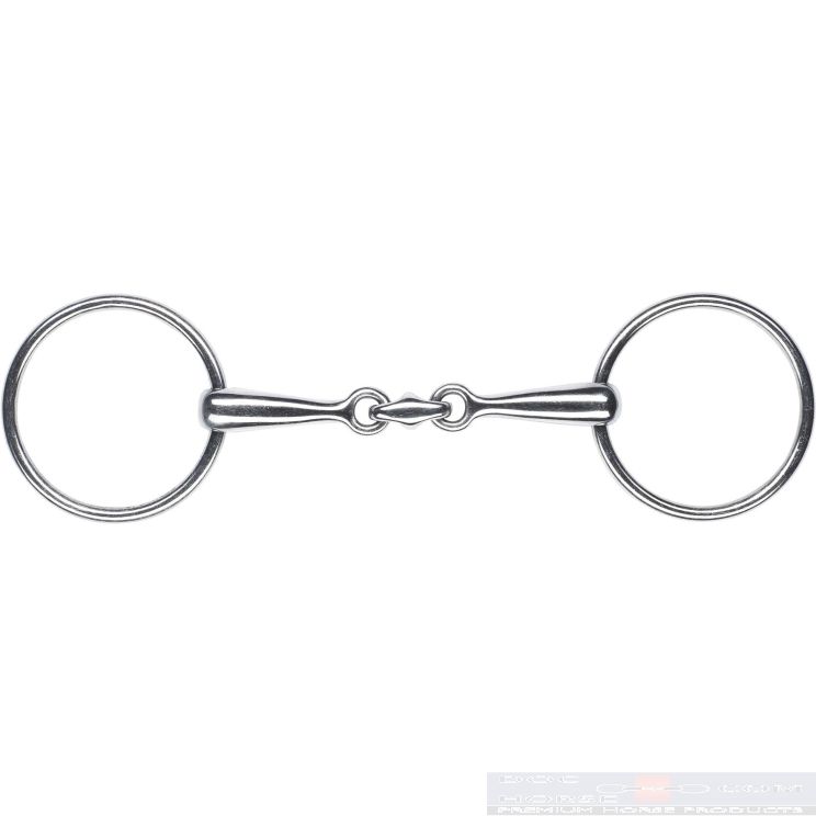 Stainless steel snaffle, 16 mm thick, with an anatomically double-jointed, thin mouthpiece: precise action and more stable contact.