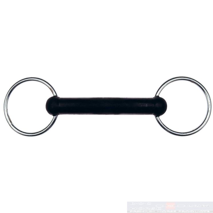 This rubber straight bit (mullen mouth) offers a wide pressure distribution and lies quietly in the mouth.