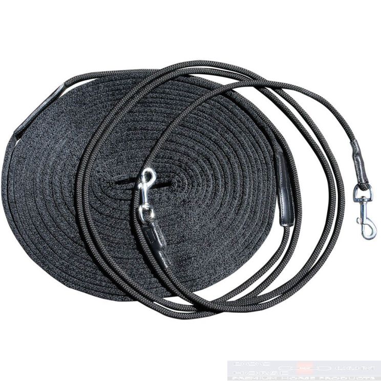 Harry-s-HorseDouble lunge consists of two round cords to attach to the bit rings by means of two silver muskatonnen. Then it will become a flat, soft webbing line.