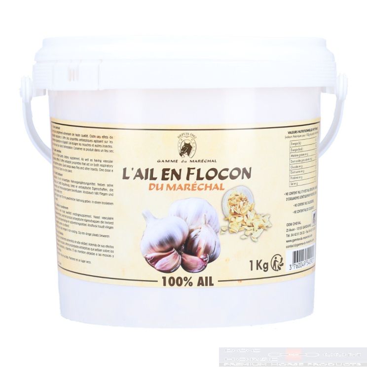 Gamme Du MarechalOpt for Maréchal's Garlic in Flake, a natural dietary supplement for horses that acts as a repellent against insects such as flies, ticks, and horseflies.