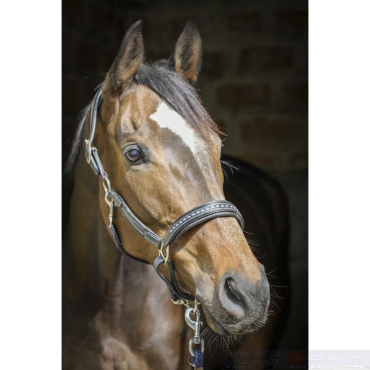 PenelopeThe leather halter has a padded anatomic headpiece with adjustment buckles on each side.