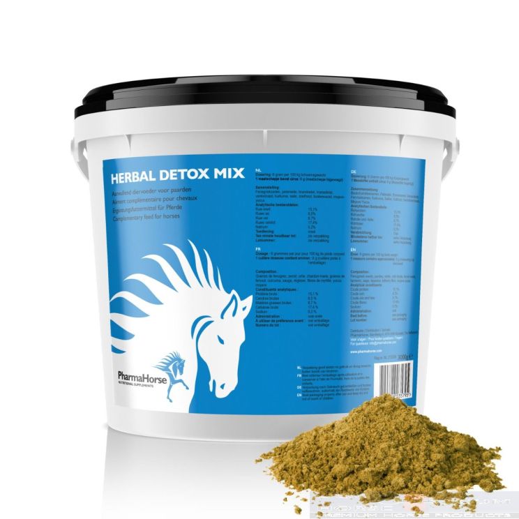 PharmahorseThe Herbal Detox Mix is a carefully crafted blend of natural ingredients, including fenugreek seeds, parsley, nettle, milk thistle, fennel seeds, turmeric, sage, licorice, blueberry fiber, and Mojave yucca. This mix helps support your horse in removing unwanted substances and restoring its natural balance.