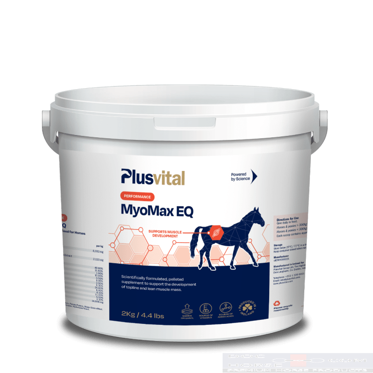 Plusvital Myo-Max EQ is een wetenschappelijk geformuleerd, gepelleteerd supplement dat is ontwikkeld ter ondersteuning van de ontwikkeling van de bovenlijn en magere spiermassa bij paarden.
