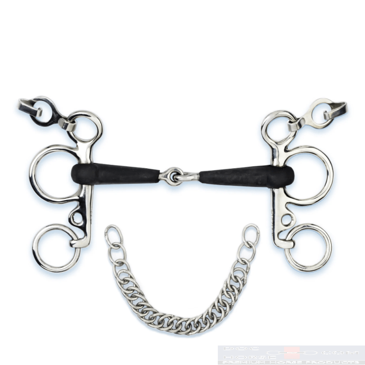 De Pelham rubber gecoat enkelgebroken is voorzien van een met rubber omhuld roestvrijstalen mondstuk en is speciaal geschikt voor paarden die metaal in de mond minder prettig vinden of baat hebben bij een zachter gevoel.